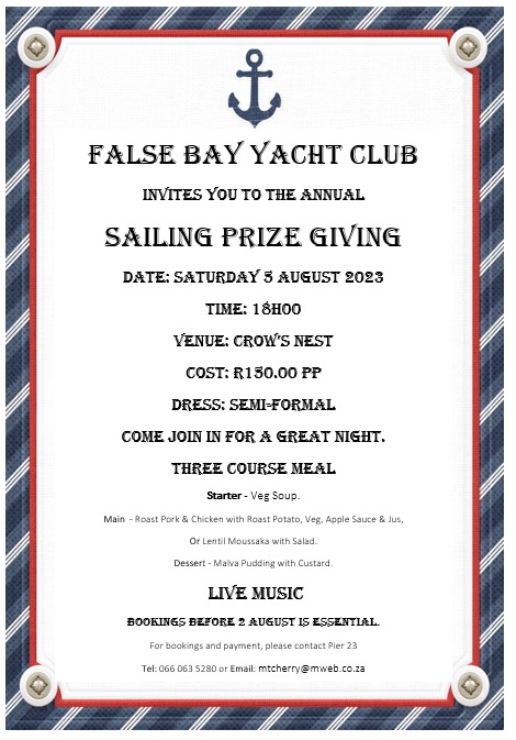 FBYC members are hereby notified that the 65th Annual General Meeting (AGM) will be held in the Crow’s Nest on Thursday 24th August 2023, at 18h00.