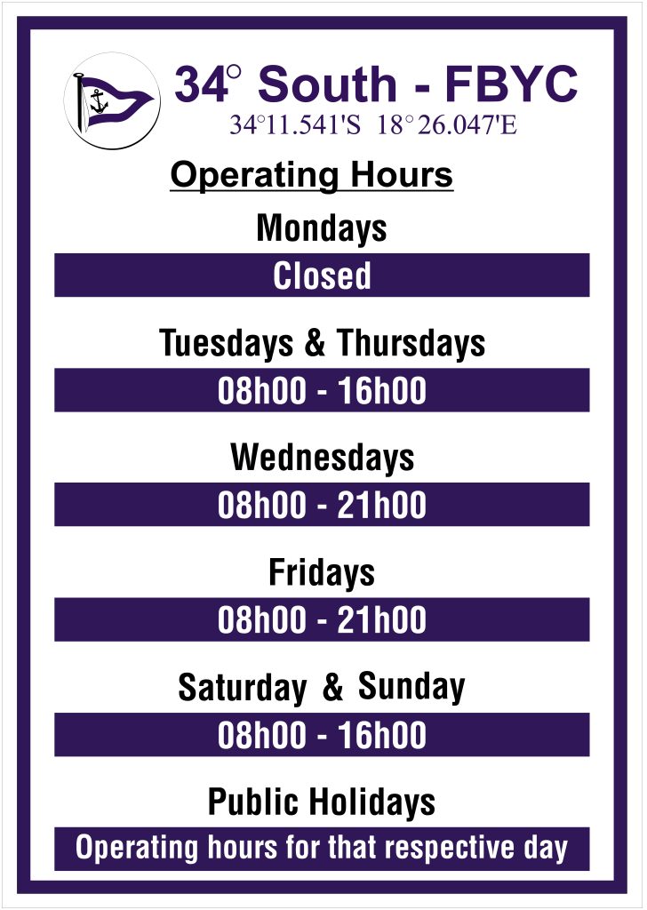 Pay a visit to our restaurant, 34º South – FBYC, which is open to the public. Look out for our signage and entrance, next to the NSRI building.